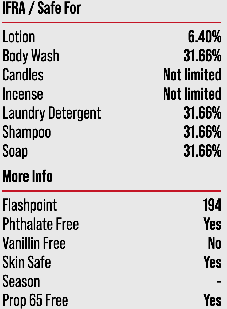 SDS and complete IFRA available upon request. Complete IFRA also provided on product labeling.