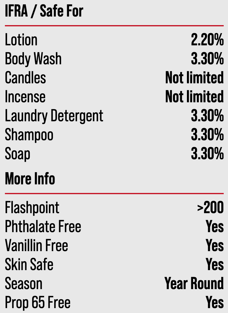SDS and complete IFRA available upon request. Complete IFRA also provided on product labeling.