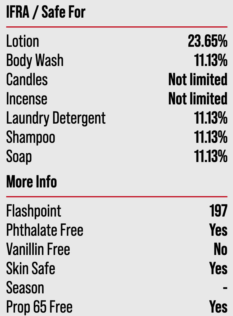 SDS and complete IFRA available upon request. Complete IFRA also provided on product labeling.